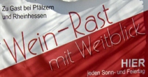 Von Weinolsheim ins Zellertal zur " Wein-Rast mit Weitblick" (ca. 25 km, nur sonntags und in den Sommer- monaten). Fahren Sie an die südliche Grenze von Rheinhessen zur Pfalz und genießen Sie mit einen Stop in Mölsheim ein Gläschen Wein. Das Zellertal mit seinem Weitblick, im wahrsten Sinne des Wortes, hat schon so manchen überrascht. Route: Sie fahren von Weinolsheim in Richtung Dolgesheim vorbei an Hillesheim und Frettenheim. In Heßloch geht es links ab nach. Westhofen. Fahren Sie durch Westhofen bis Sie an einen Kreisverkehr kommen. Dort dann die zweite Ausfahrt Richtung Gundheim. Durchfahren Sie Gundheim und weiter nach Flörsheim - Dalsheim. Vor Flörsheim-Dalsheim geht es rechts ab, fahren Sie weiter bis zu einer großen Kreuzung. Diese überqueren Sie in Richtung Mölsheim. Nach ca. 5 km haben Sie den Zielort erreicht, wie es immer so schön heißt. |
